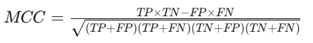 - 定义:衡量二分类模型质量的指标,考虑了所有混淆矩阵元素。